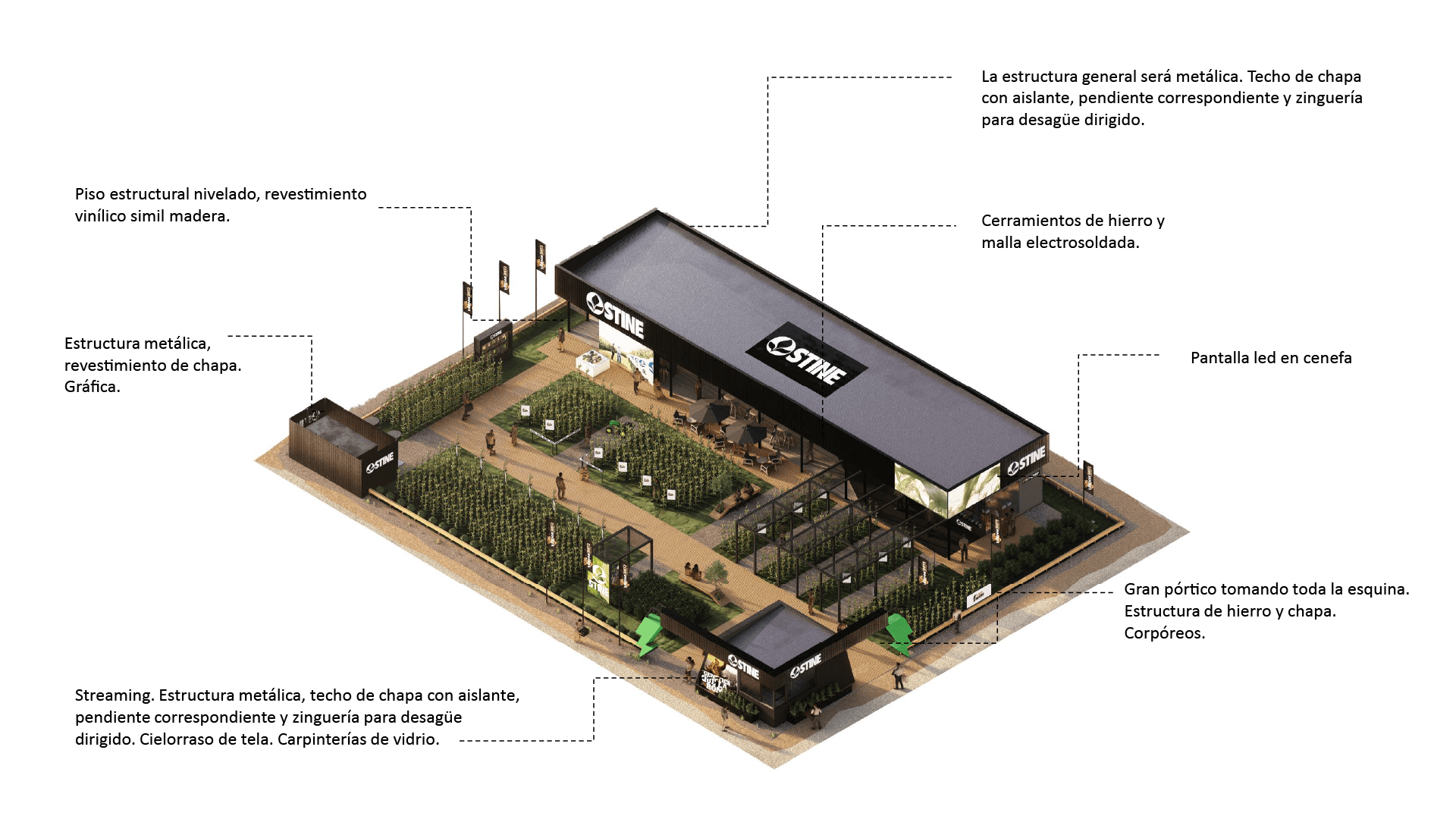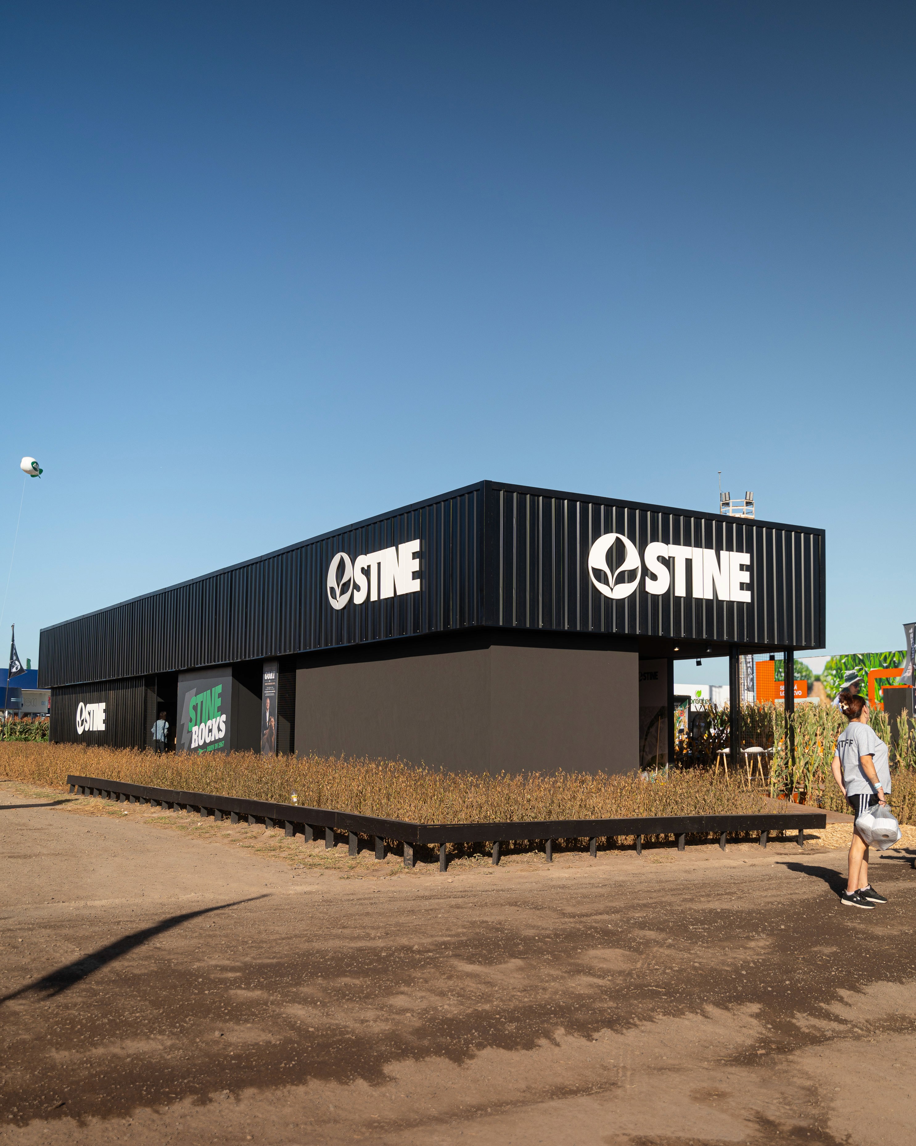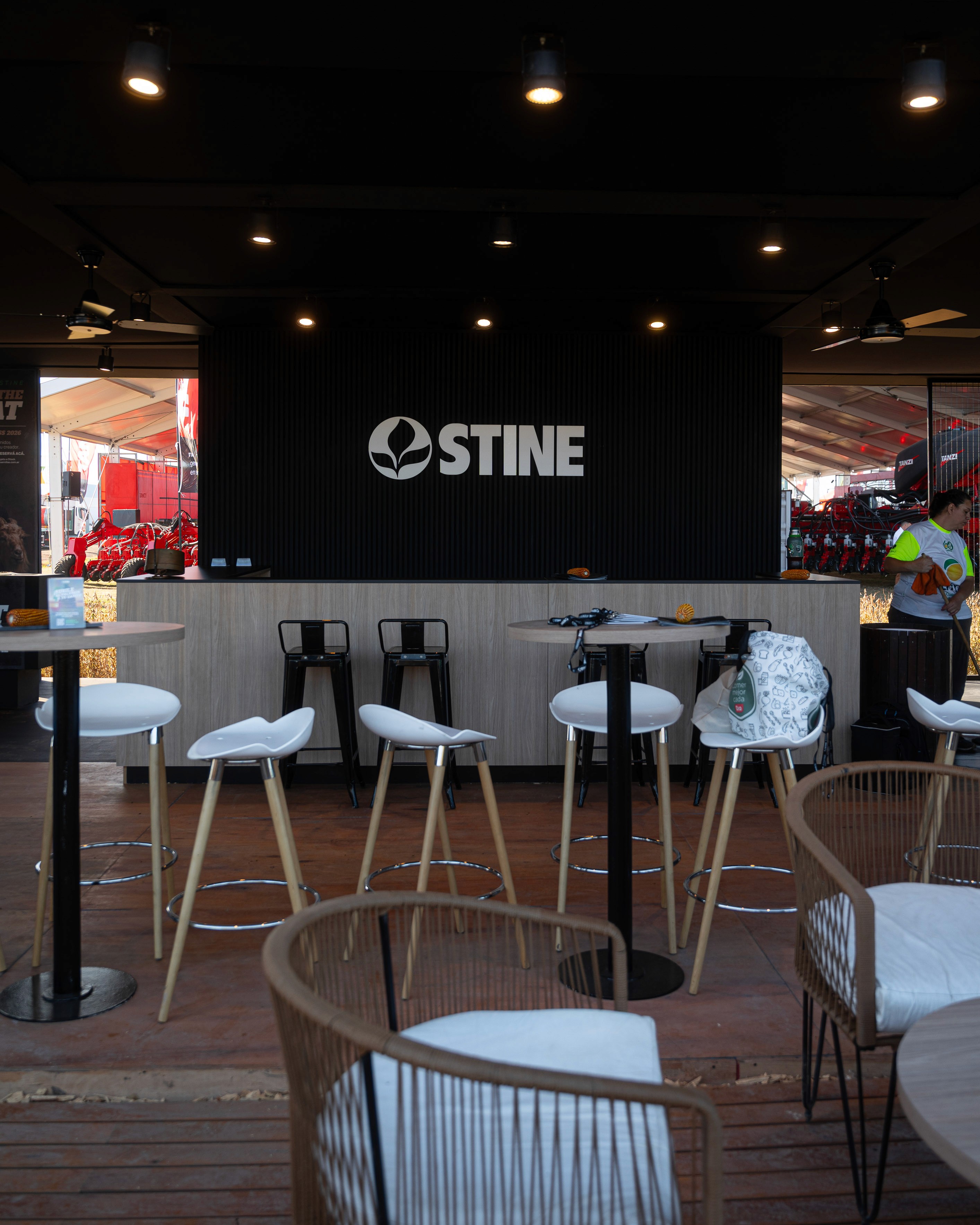 a propuesta desarrollada para el stand de STINE se organiza a partir de una idea rectora clara: La concepción de un volumen simple, contundente y de fuerte presencia espacial. Se prioriza una implantación clara, que facilite la lectura de los accesos y concentre el impacto visual en sectores estratégicos, reforzando la identidad de marca. El diseño se estructura en torno a funciones bien definidas que articulan la experiencia del usuario: • Sector STINERS: espacio principal de encuentro y ventas, pensado como punto de contacto directo con clientes y visitantes. • Sector bar: área diseñada para reforzar la experiencia de marca, promoviendo la permanencia, el intercambio y un vínculo más distendido. • Sector oficina / depósito: espacio de apoyo para el equipo, con la capacidad y condiciones necesarias para un uso cómodo y eficiente. • Sector de merchandising: destinado a la exhibición y entrega de productos identificatorios de la marca. • Muro de la fama: concebido como espacio de ingreso y elemento narrativo del stand, donde se expresa el concepto central de la propuesta: “STINE ROCKS!”, reforzando el carácter innovador y protagonista de la marca. La propuesta mantiene una estética profesional y joven, con energía y potencia visual, alineada con los valores y el espíritu de STINE, logrando un stand que no solo comunica, sino que genera impacto y experiencia.
