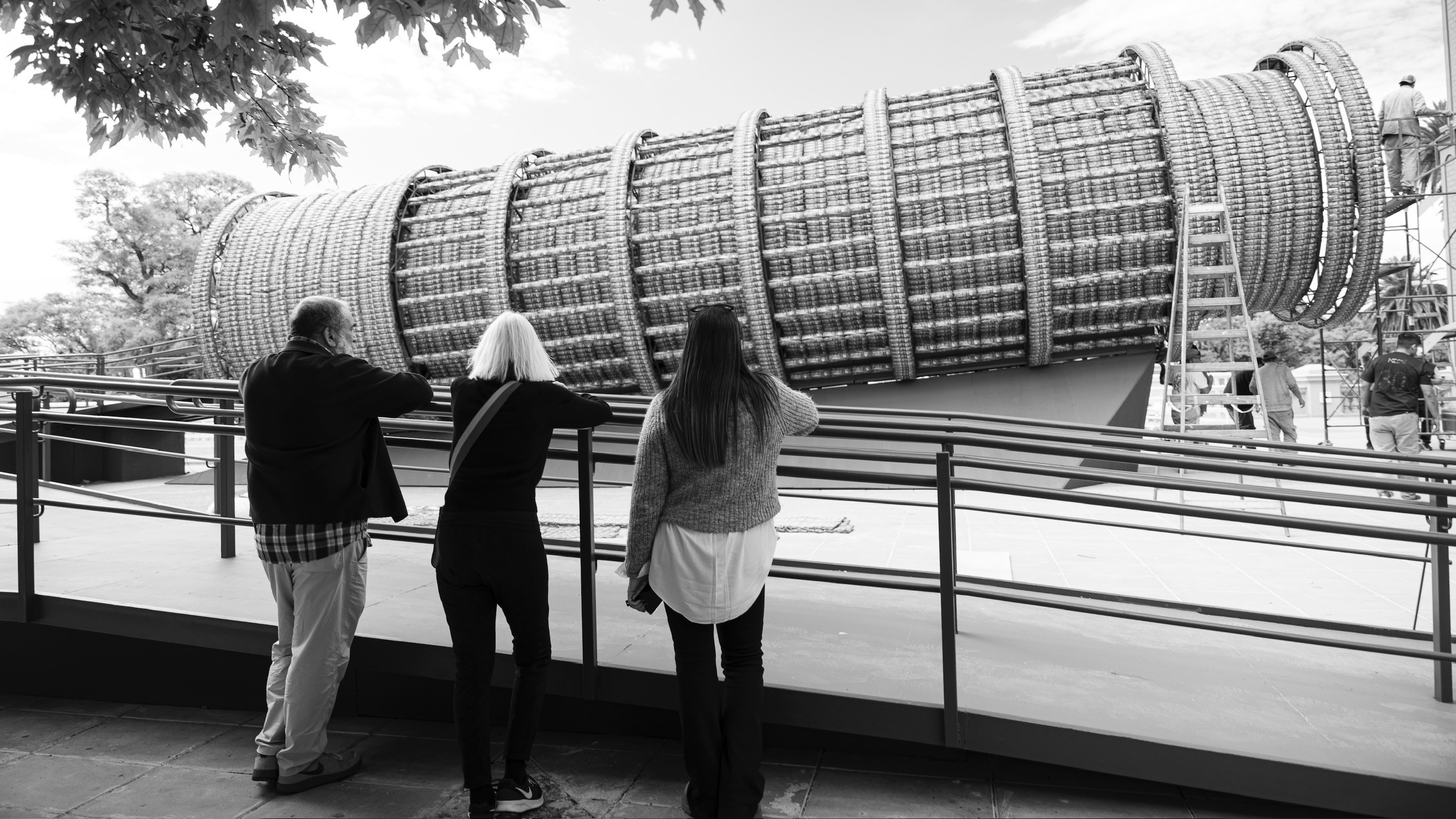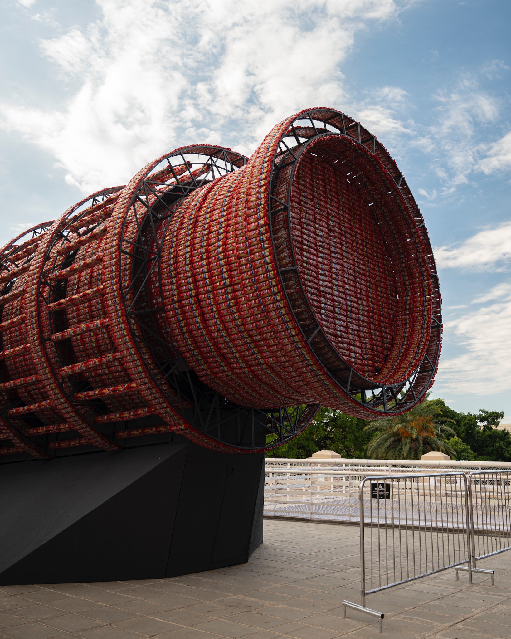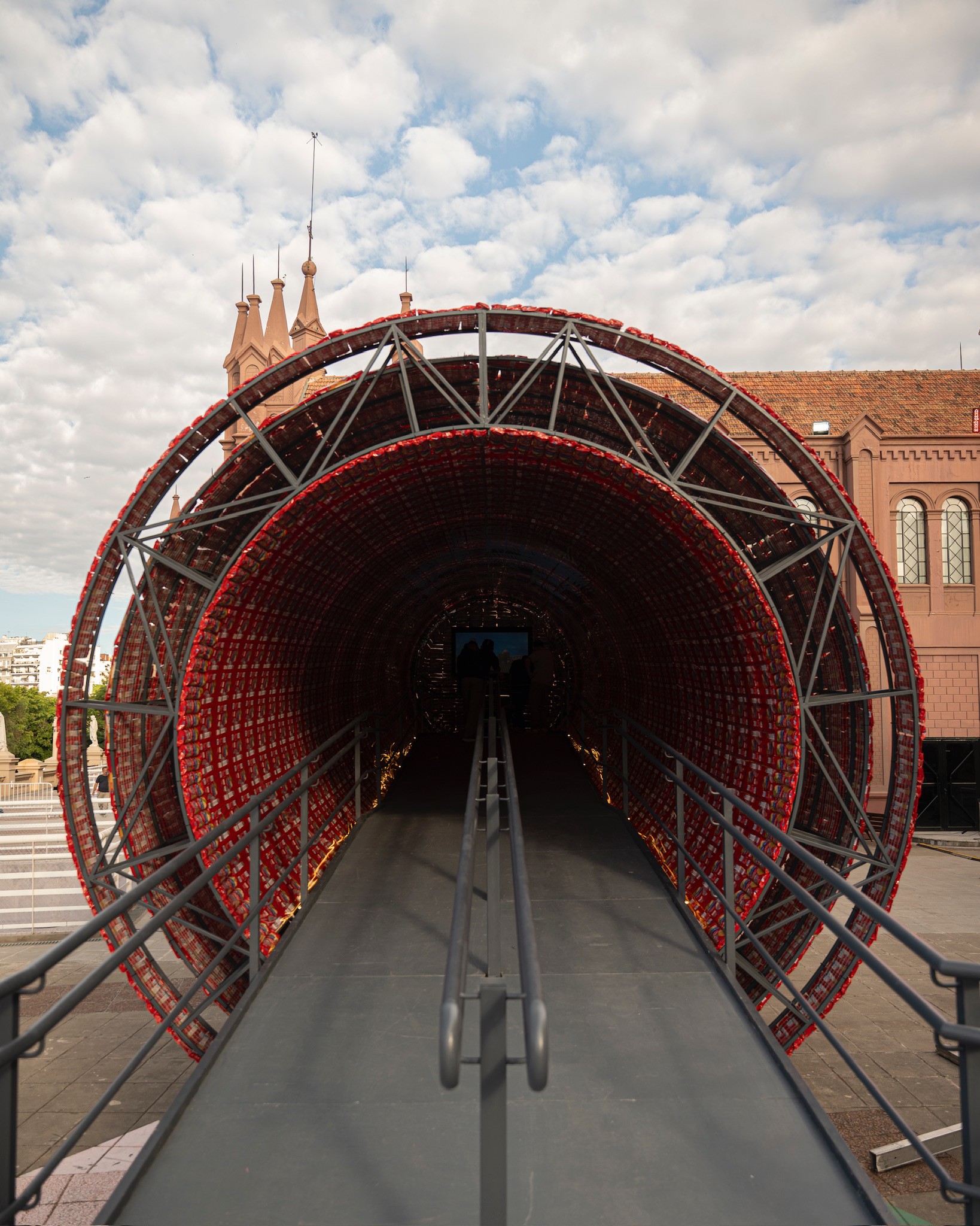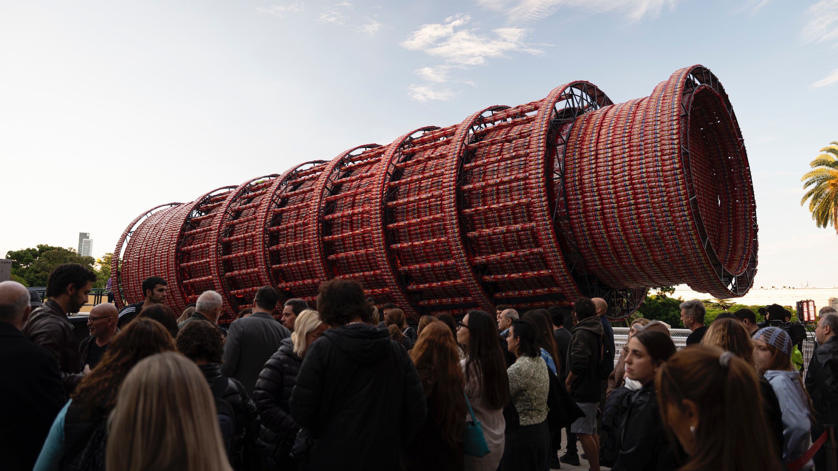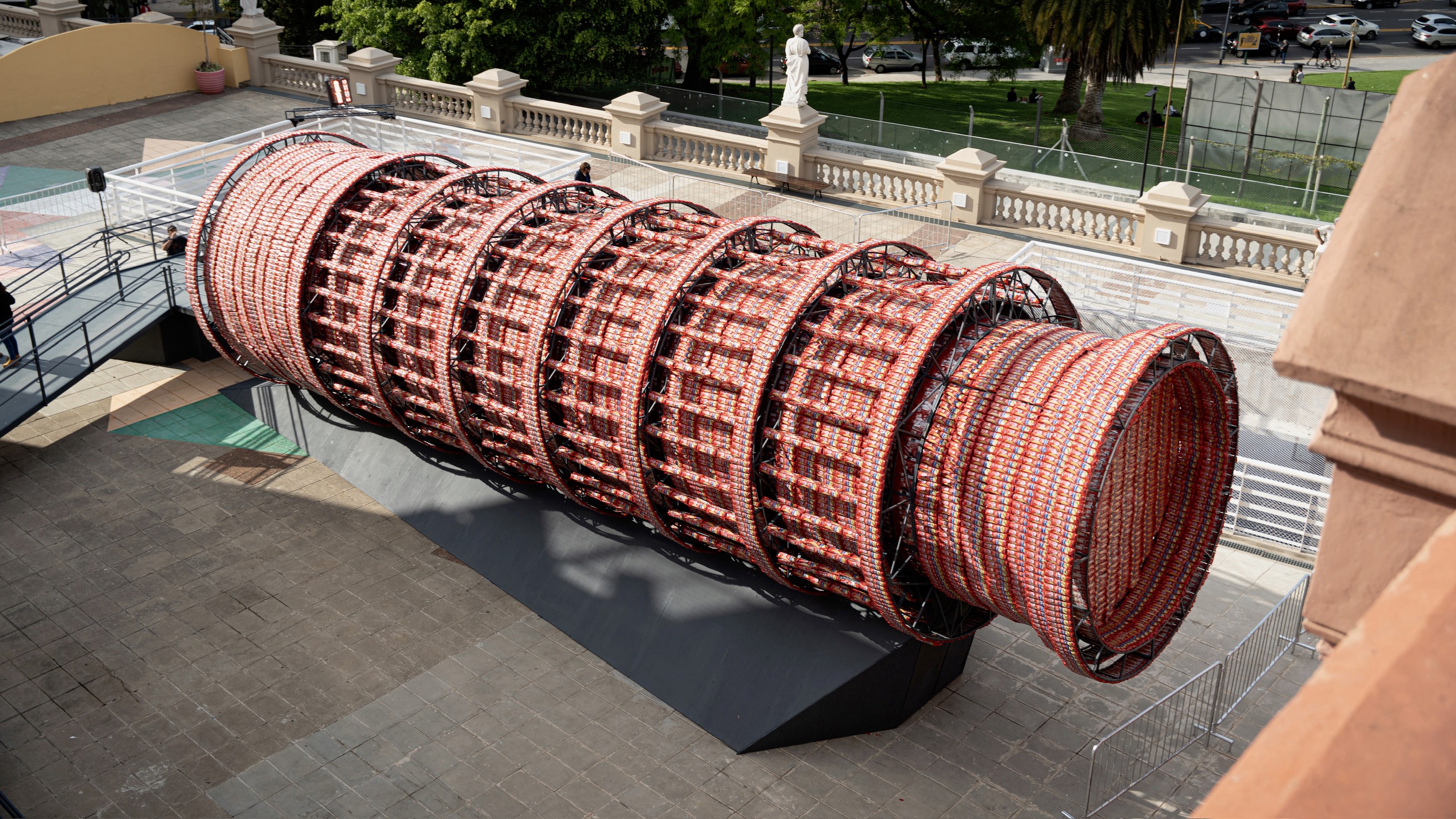 ”La torre de Pisa de Spaghettis retoma la reflexión sobre “la caída de los mitos universales” concepto que Minujin desarrolla desde los años sesenta para desestabilizar a aquello que se considera intocable o monumental. La artista traslada ahora el imaginario gastronómico a una de las arquitecturas más reconocibles del mundo, desplazando el peso de la historia hacia el territorio del juego. Realizada a partir de un material tan cotidiano y accesible como los espaguetis, la obra propone un cruce entre tradición e ironía, entre memoria cultural y disfrute colectivo. Lo grandioso se vuelve cercano y lo cotidiano asume una escala extraordinaria. La instalación, de casi 20 metros de altura, invita a ser recorrioda desde el interior a traves de una rampa accesible que recupera la dimensión participativa clave en la obra de Minujin. Como en toda su producción, Minujín convoca a vivir en arte como un acto de encuentro social: un Espacio donde el humor y la imaginación se convierten en un ejercicio lúdico de libertad”.