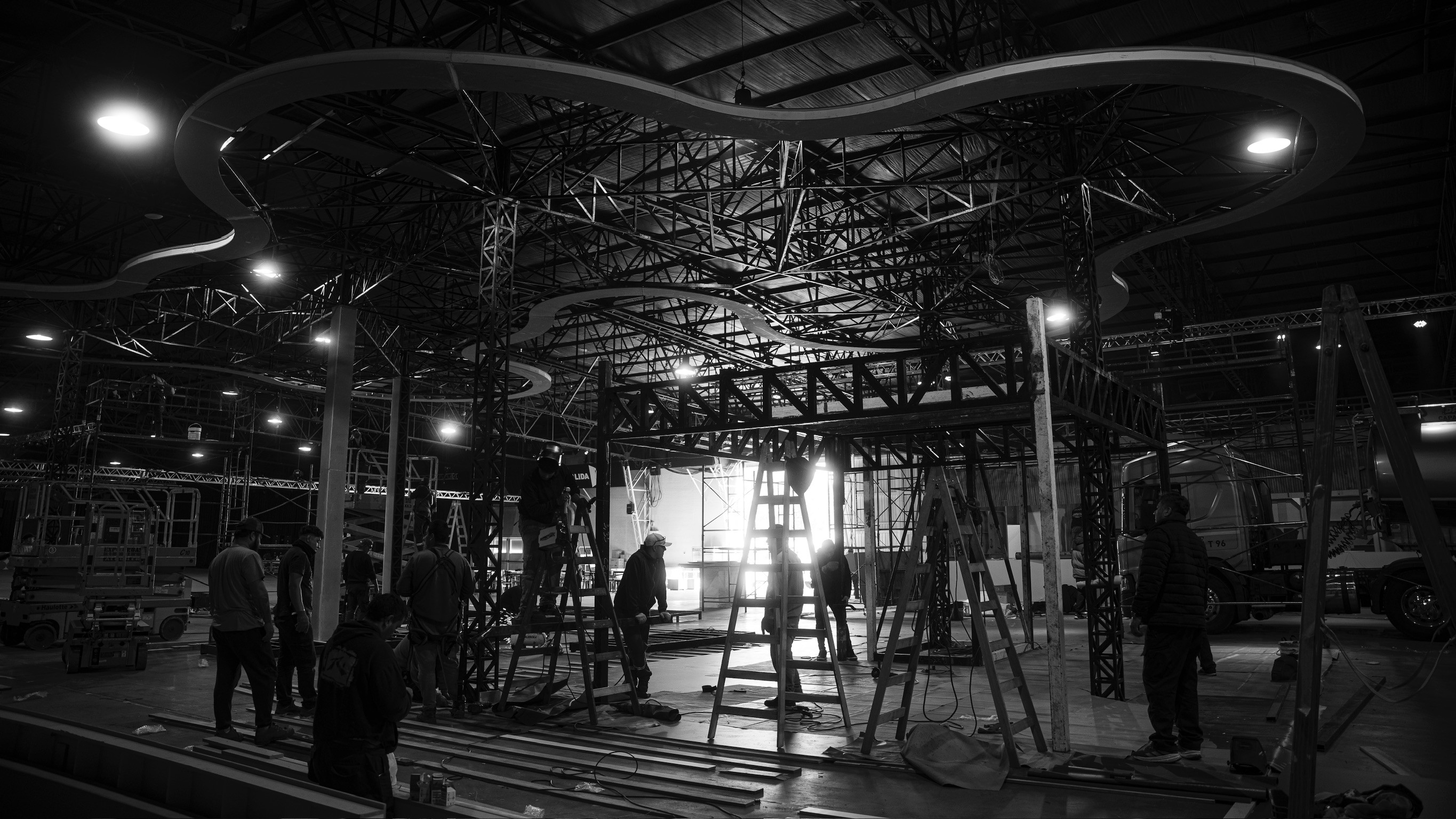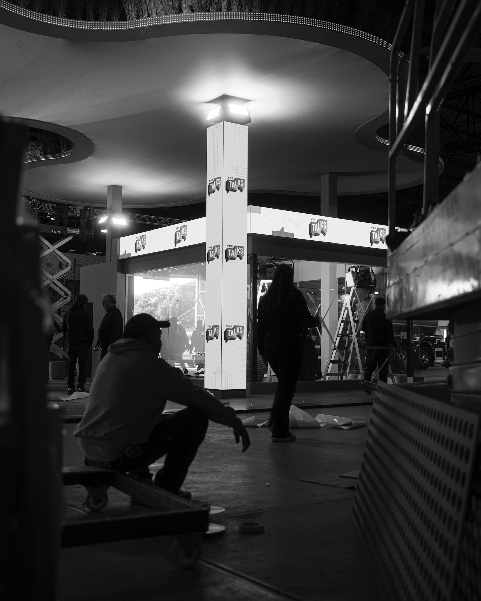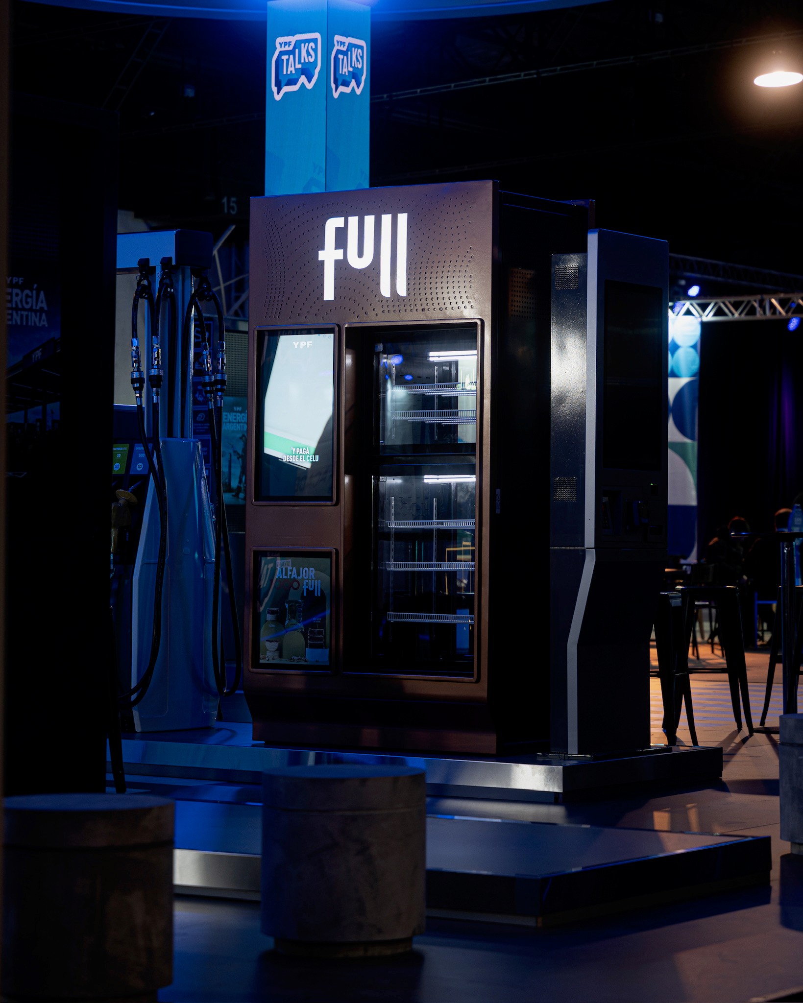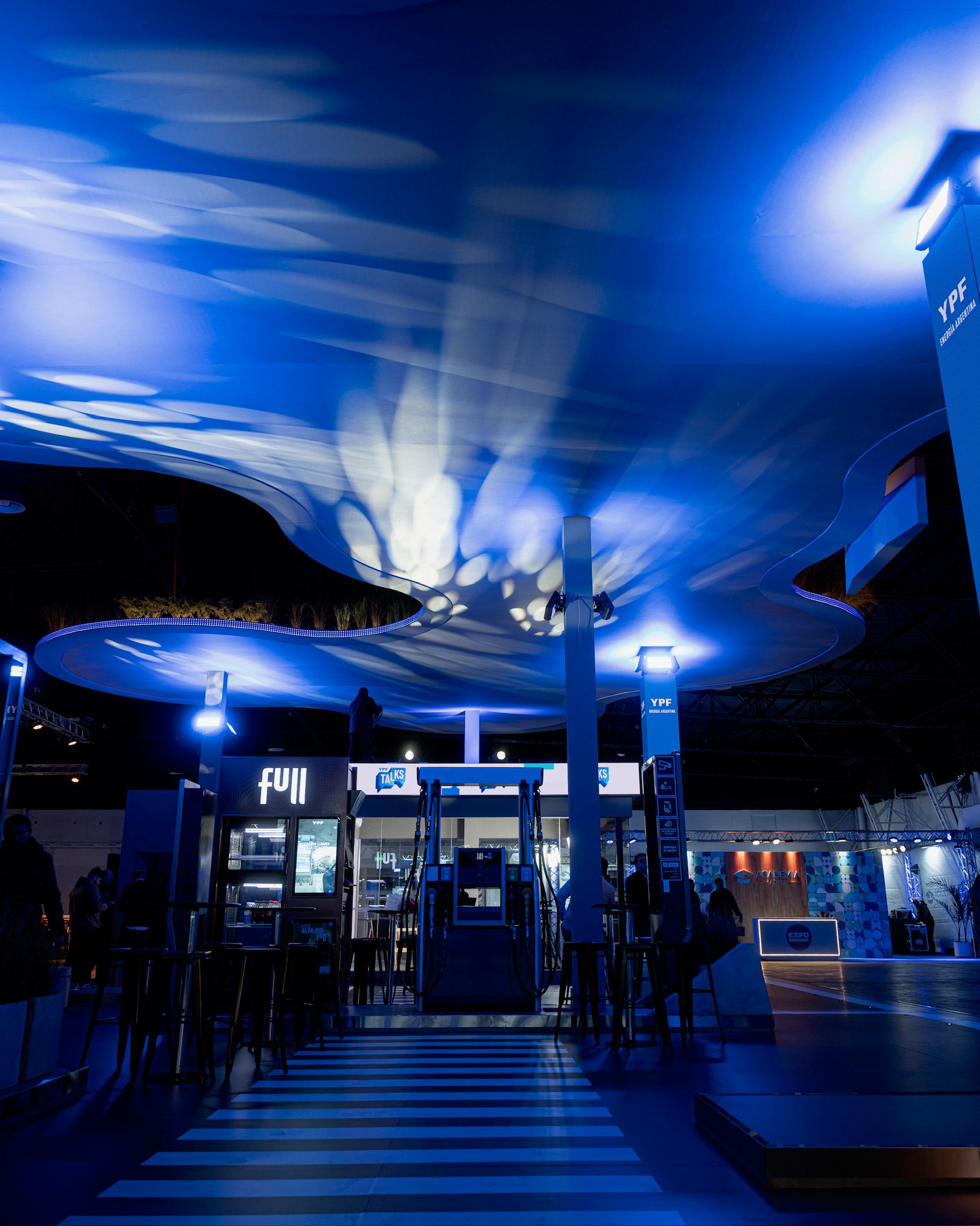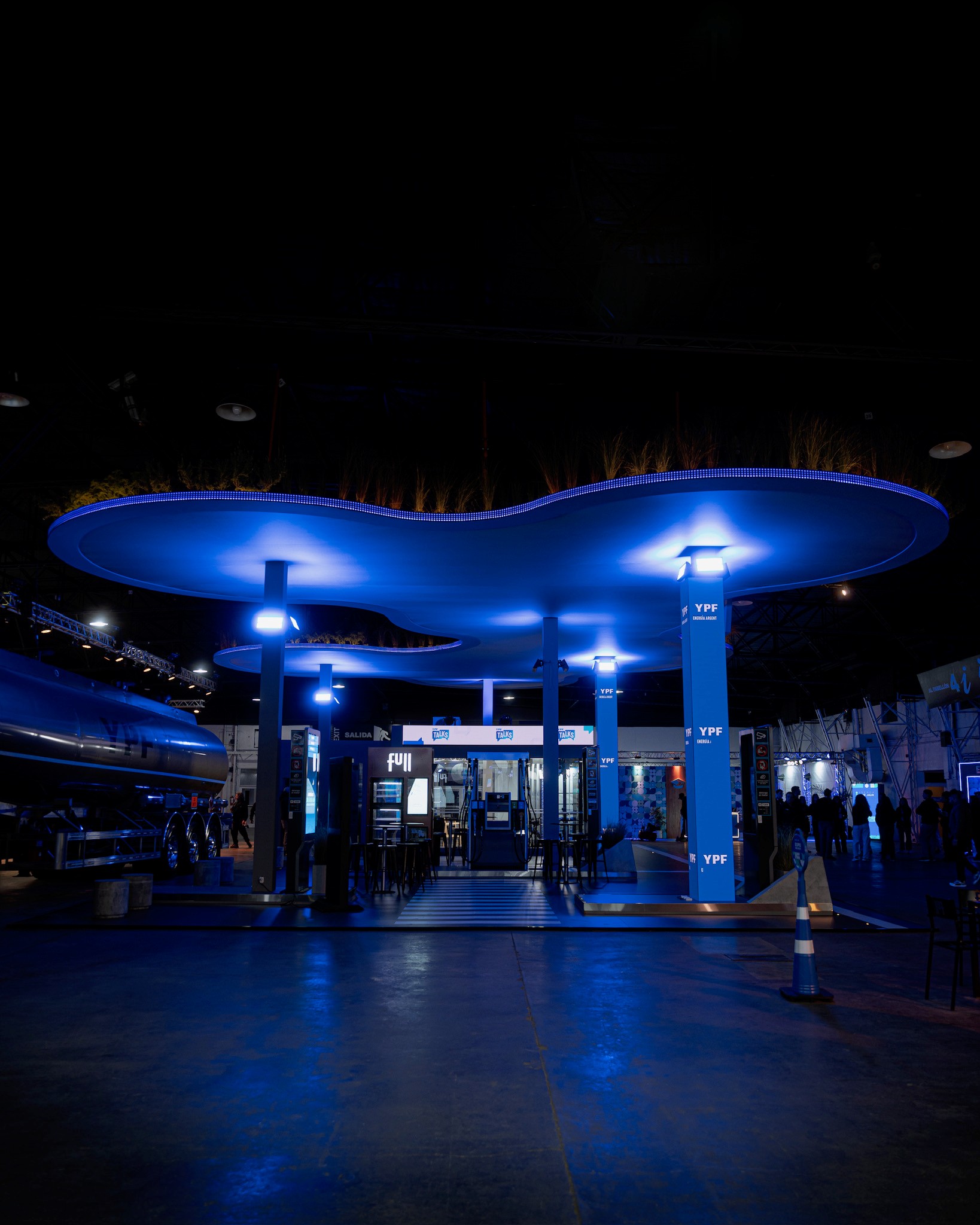 Para el desarrollo de este stand, tomamos como referencia la primera “YPF del futuro”, un proyecto existente ubicado en Figueroa Alcorta y Echeverría, en la Ciudad de Buenos Aires. A partir de su estudio, analizamos en detalle tanto el sistema constructivo como el planteo arquitectónico, con el objetivo de realizar una síntesis que transmitiera el espíritu innovador y la identidad de dicha estación. En función de las diferencias constructivas posibles propias de un montaje, diseñamos un sistema estructural adaptado que nos permitiera replicar el característico techo de hormigón armado mediante una estructura metálica autoportante, liviana y prearmada, pensada para poder realizar el montaje completo en tan solo 3 días.